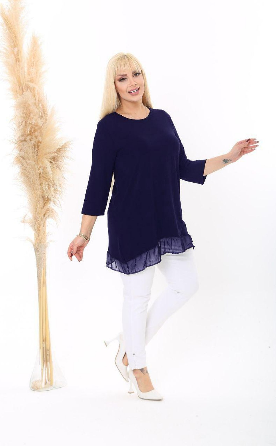 Стилна дамска блуза с 3/4 ръкави и пиплум от дантела в края
